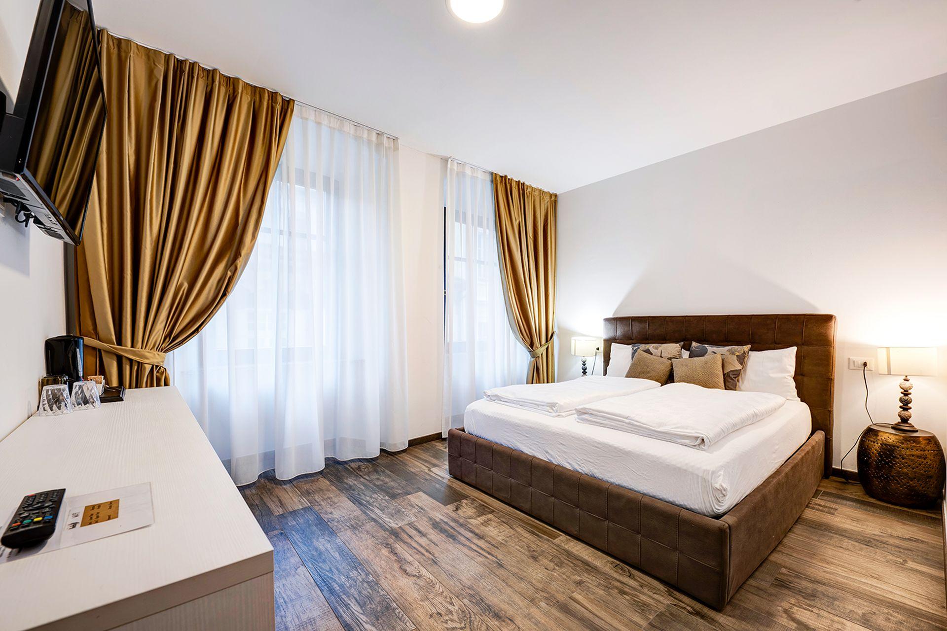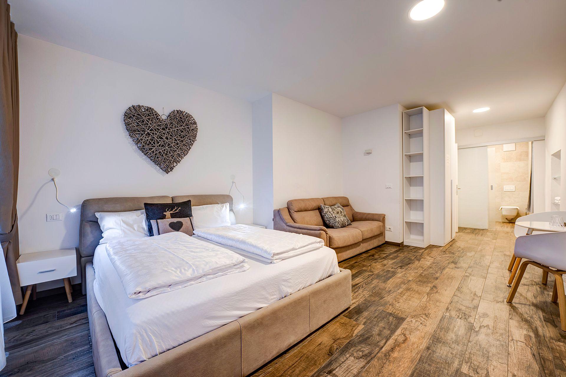Piccola? Sì, ma sorprendente. La Pimento Room è un nido raccolto e silenzioso, perfetto per chi cerca tranquillità nel cuore di Merano. È l’unica camera che non si affaccia sui portici, e proprio per questo regala un’atmosfera più intima e riservata. Il punto forte? La parete in vera pietra naturale che abbraccia il letto, donando un tocco autentico e materico allo spazio. I 19 m² sono ottimizzati con cura: letto matrimoniale comodo, arredi essenziali, bagno privato moderno. Un rifugio di quiete e carattere. Per chi ama le piccole cose fatte bene.
